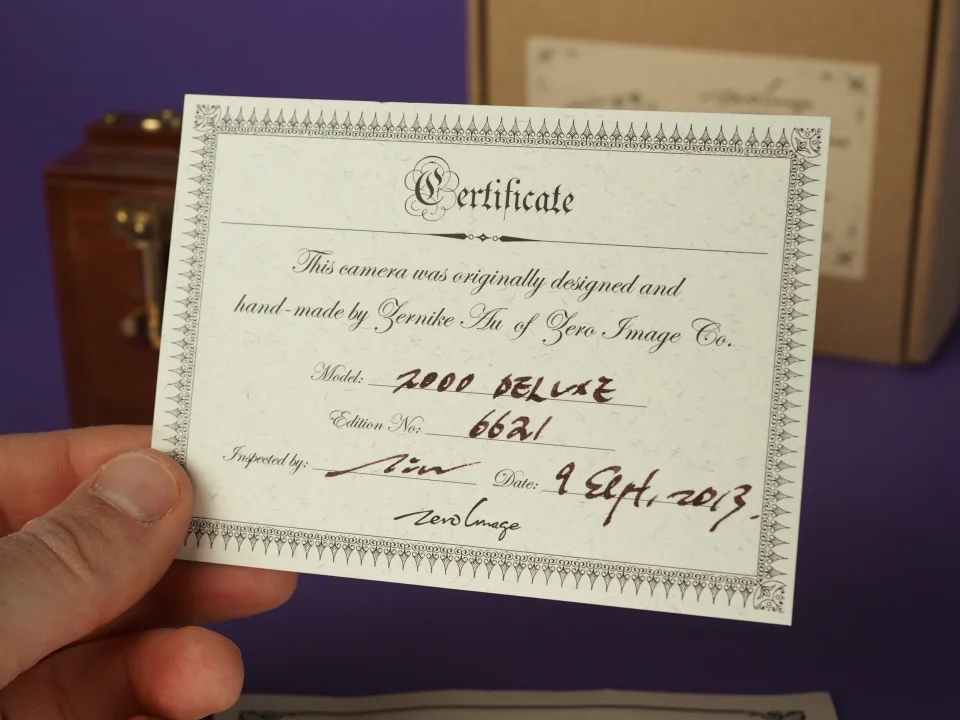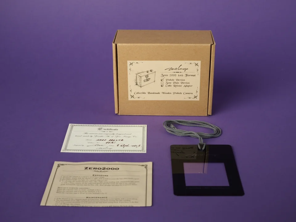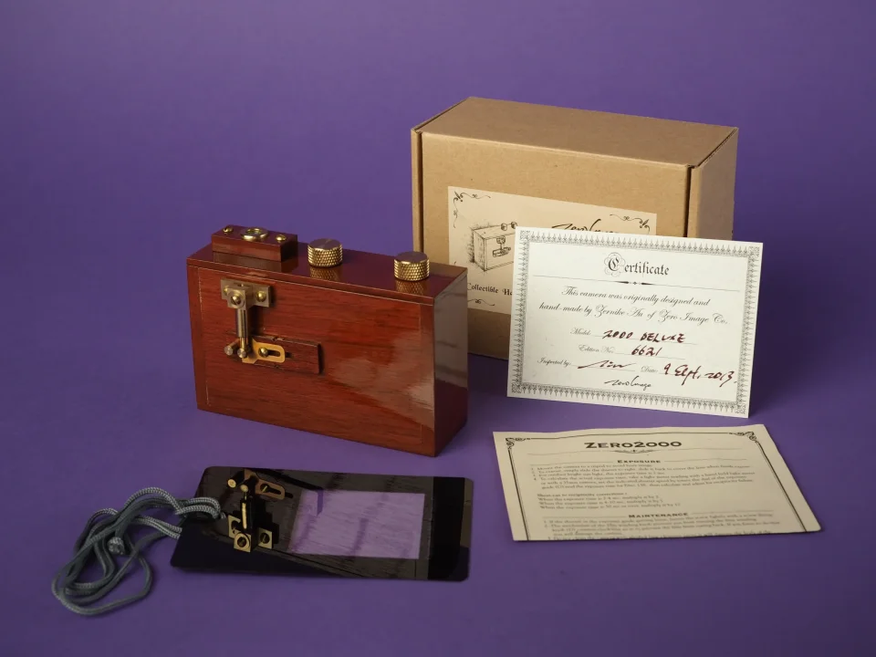 Lochkamera "Deluxe": Fein aus Teakholz und Metall gearbeitet handelt es sich bei der Zero Image 2000 um eine 6x6 Lochkamera für 120 Mittelformatfilm in der "Deluxe"-Ausführung. Sie misst ca. 28x80x130mm, weisst laut Hersteller eine Blende von 138, sowie eine Brennweite von ca. 25mm auf. Das Angebotene Exemplar ist - sowohl Optisch, als auch in der Funktion - quasi in Neuzustand.